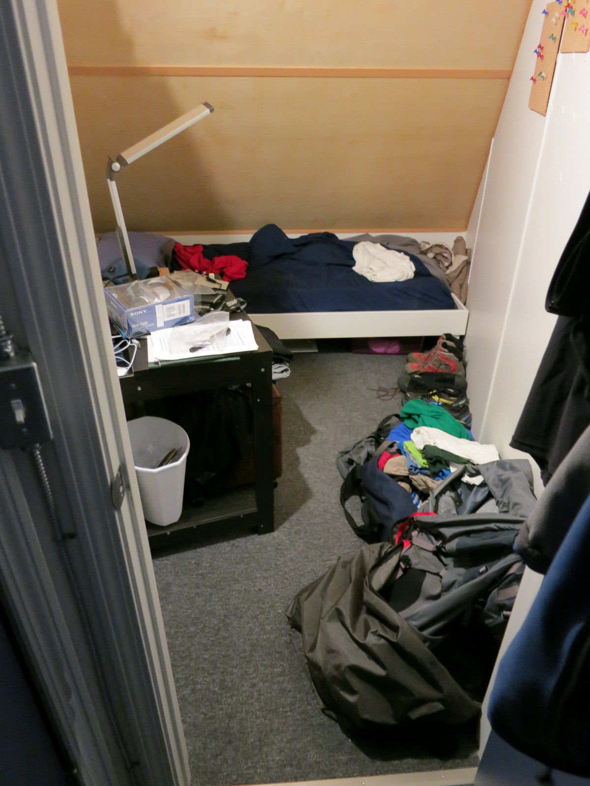 We each have our own bedroom, it’s got enough room for a single bed and a little storage. It’s about 44 sq ft total and just long enough so that my feet don’t touch the wall when I’m in bed. The room slopes down at the end over the bed and I’m sure it is just a matter of time until I wang myself on it.