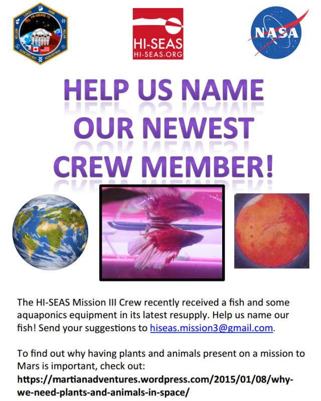 We got a mission patch designed, as the mission was beginning, and the finished product just got delivered. They turned out quite nicely. There is one symbol to represent each of our individual research areas. Clockwise from top: Jocelyn – Brain/puzzle, to represent her research on stress, sleep, exercise, etc. Sophie – Tensegrity robot, for […]
